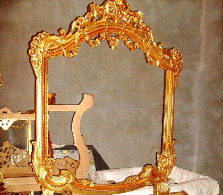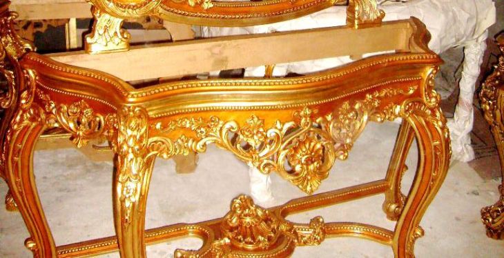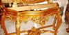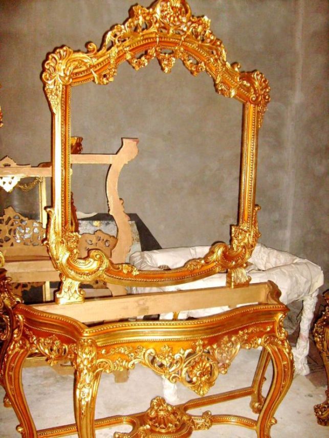 French Louis XV style carved and gilded serpentine shape console table with mirror, marble topped, finished in pure gold and orangish gilding patina, pierced apron with seeded frieze, foliate scrollwork motifs, foliate pendants, sea-shells and garlands on cabriole legs and stretcher.