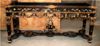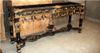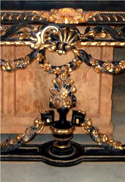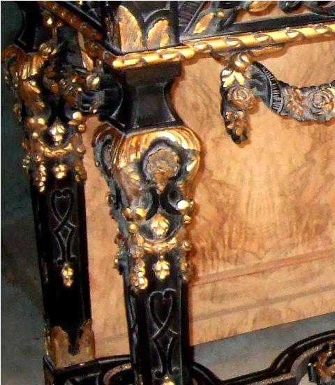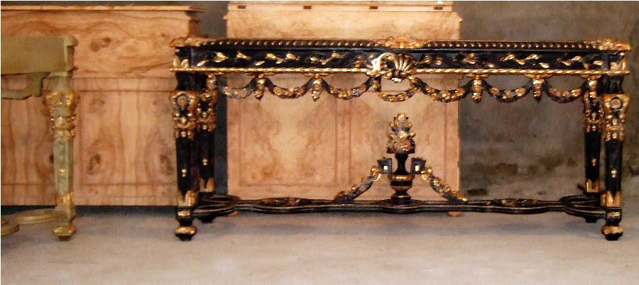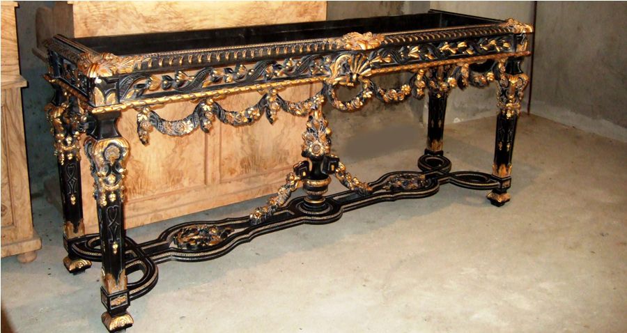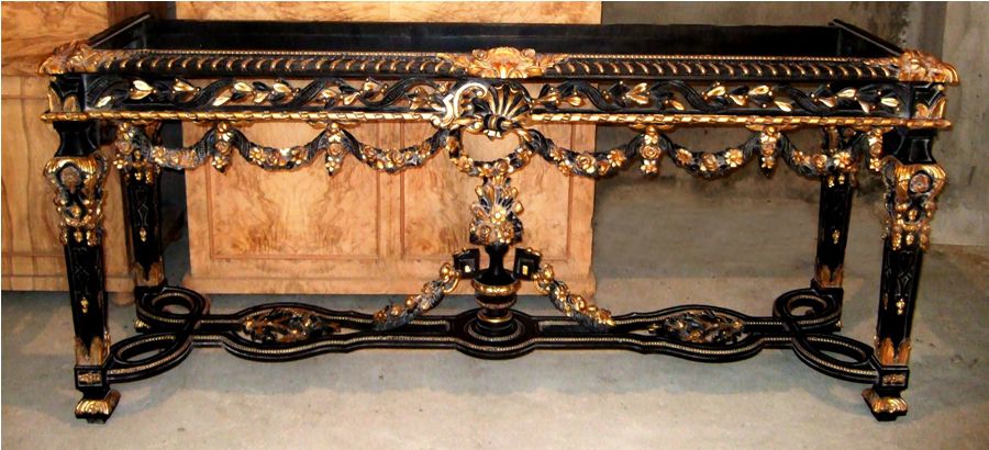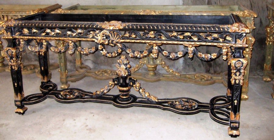 French Louis XIV Rococo style carved, painted and gilded console table, finished in aged dusty black color and gilt ornamented with French gold foils on carvings, with inset marble top, ornamented with budded pendants and guilloche works, cartouches, garlands, sea shell and swagged laurel-wreathed motifs, with pierced apron on tapering legs joined by an entwined seeded leafy stretcher surmounted with flowering urn.
