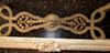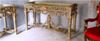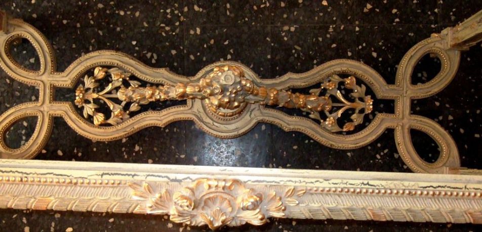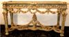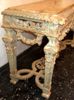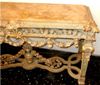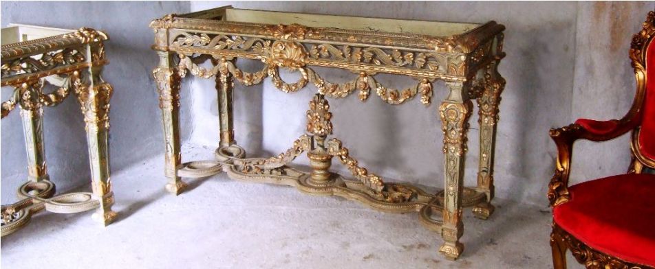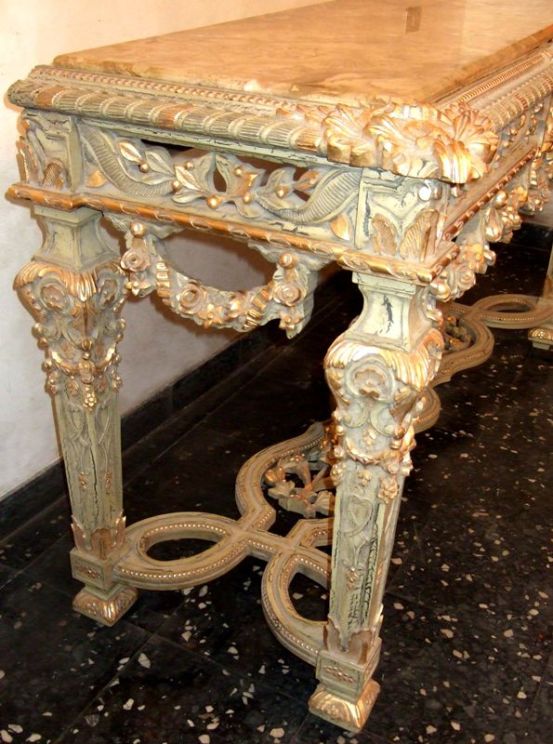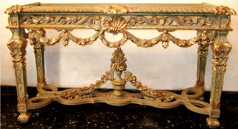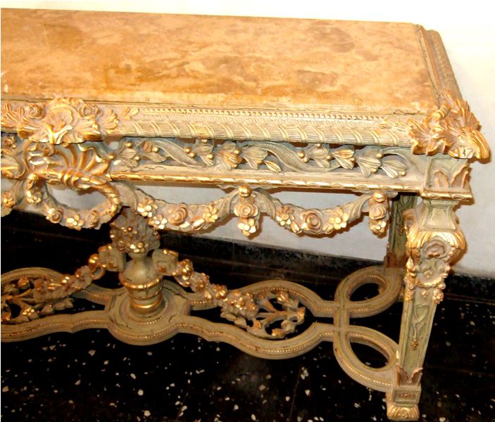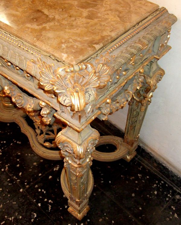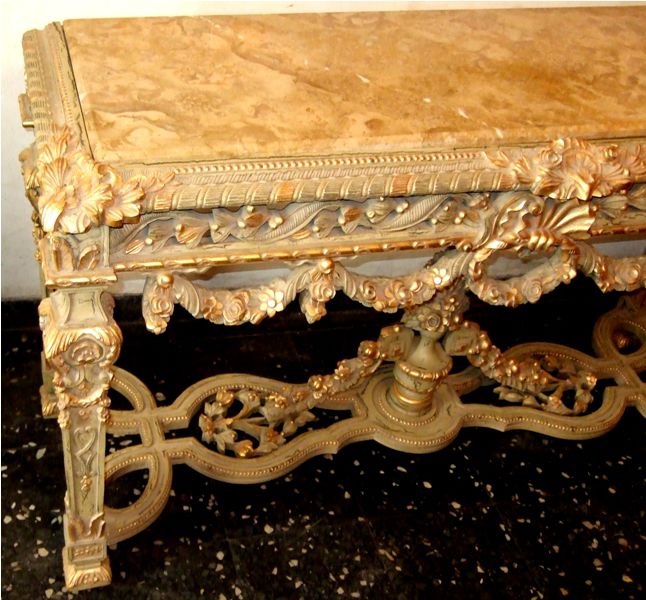 Carved giltwood console table on the Louis XIV manner, finished in aged dusty light olive green crackle style and ornamented with French gold foils, ornamented with foliage pendants, garlands, scallops, seeded frieze, swags, leafy pierced apron surmounted with inset marble top, the tapering legs joined by an entwined stretcher with foliage and flowering urn.