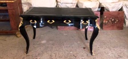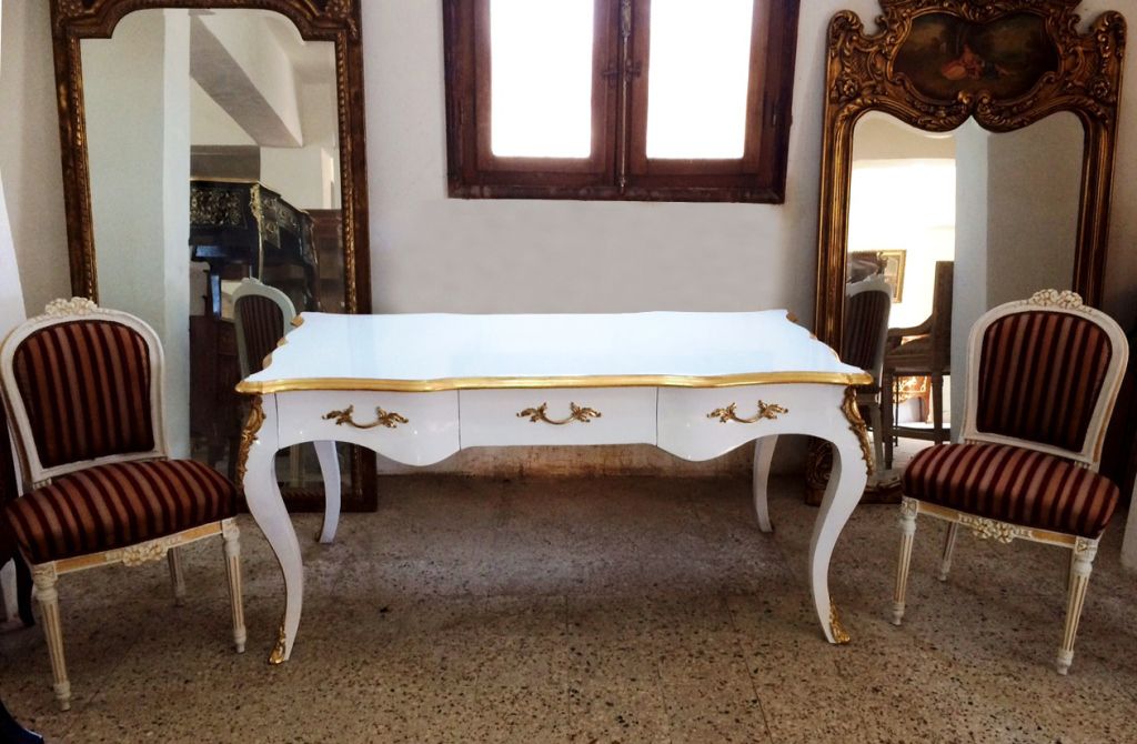 Fine and delicate French Louis XV style three drawers Bureau Plat with cabriole legs highly finished, painted in white, edged with French gold foils. The desk is ornamented with ormolu mounts and terminating with ormolu sabots. Both Satin & Shiny finish are available. Available in Black color as well per request.
