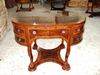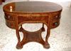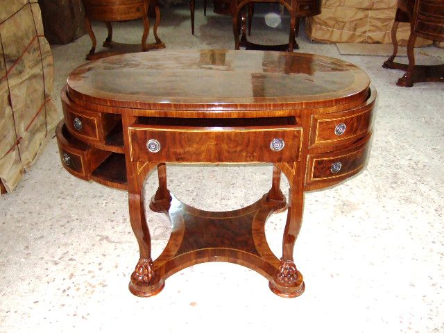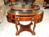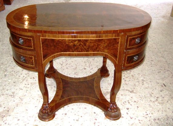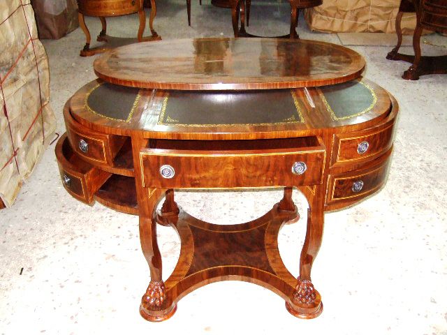 Unique English style desk with sliding top above sectional golden framed leather top, five sliding drawers, inlaid with the finest veneers and chippendale style paw feet.