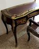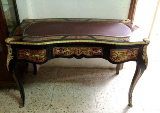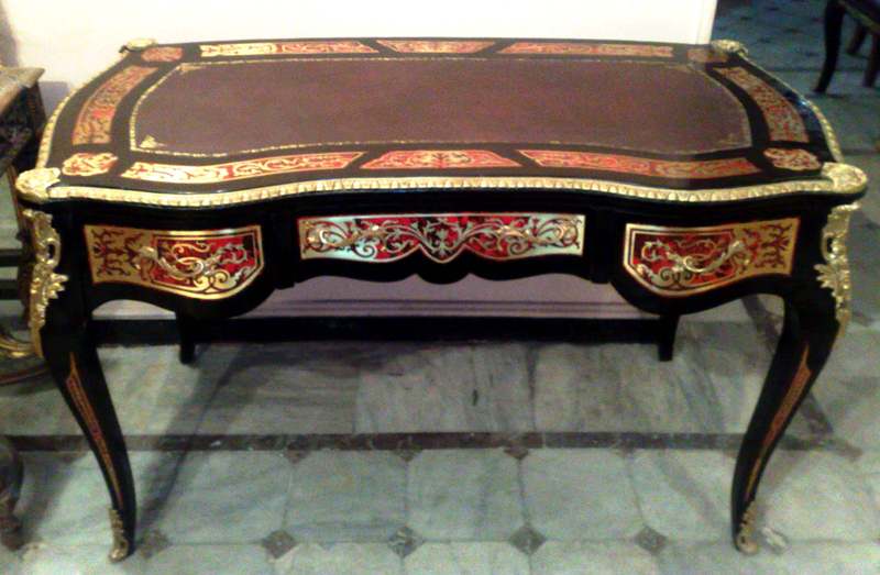 A Louis XV Andres Charles Boulle style ormulu-mounted tortoiseshell and engraved brass marquetry and ebony finish cabriole legs desk with three drawers and leather top.