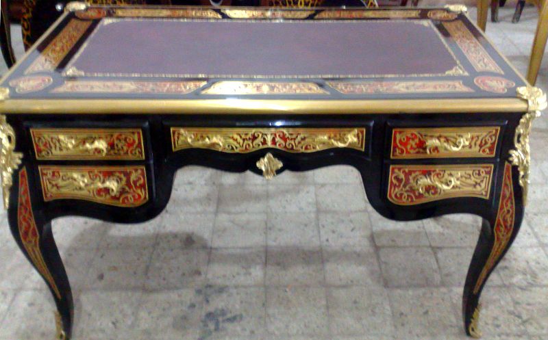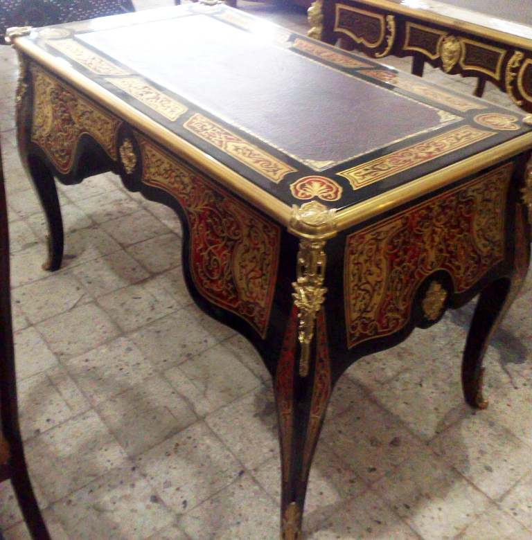 A Louis XV Andres Charles Boulle style ormulu-mounted tortoiseshell and engraved brass marquetry desk with five drawers and leather top.
