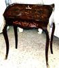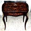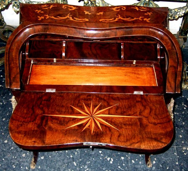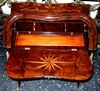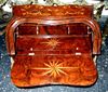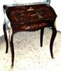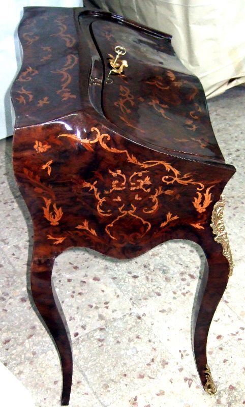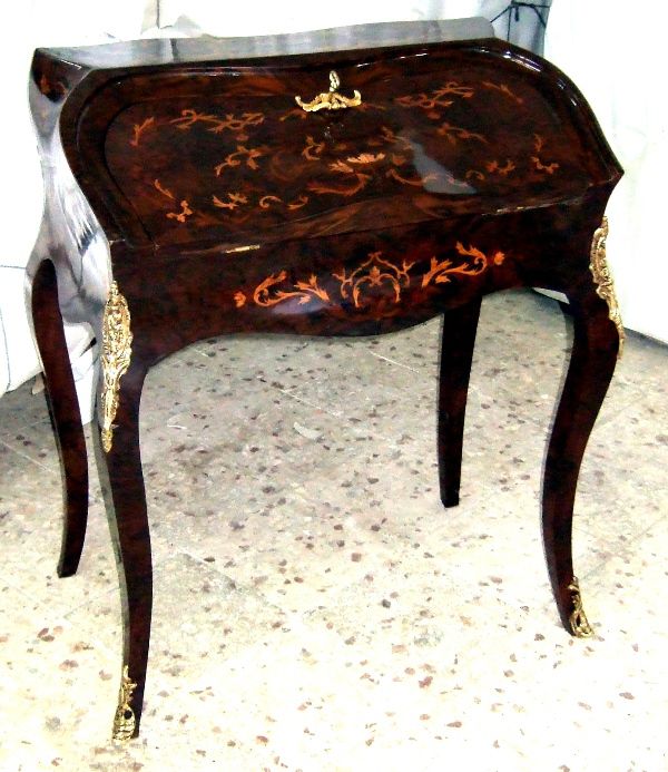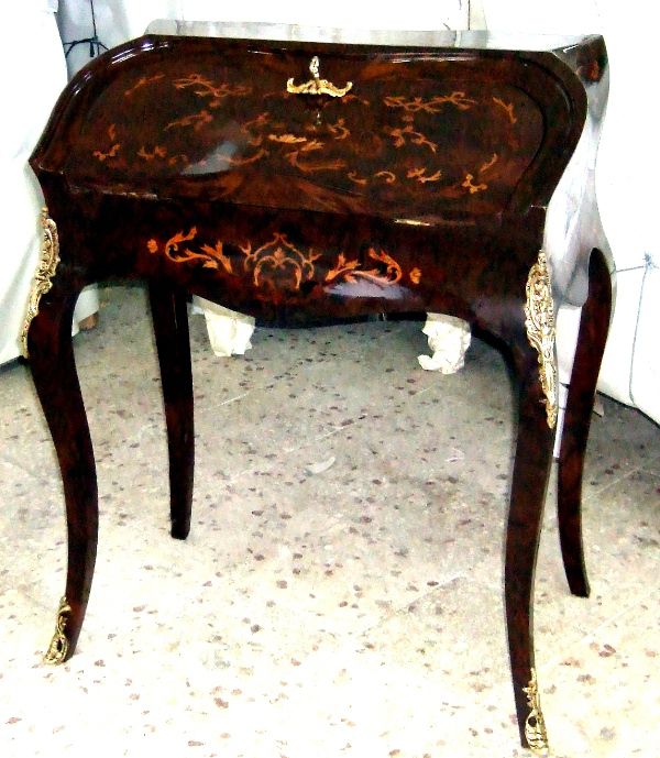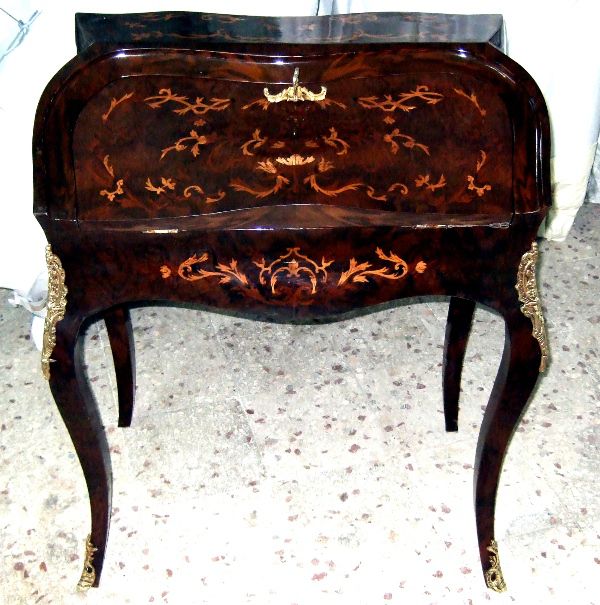 Bombé ormolu mounted veneered bureau de dame, in Louis XV style, with fall front writing surface and an open shelf above three small holes above a well with sliding cover, inlaid all over with beautiful marquetry patterns, with cabriole legs.