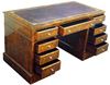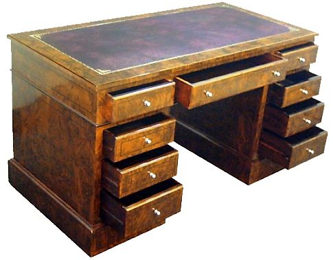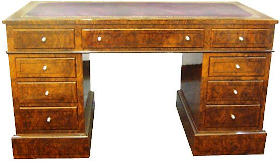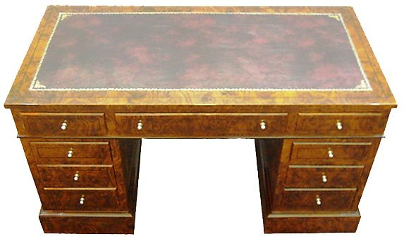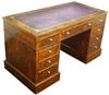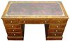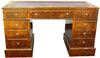 Large English style mahogany veneer inlaid nine drawers desk with a leather top. REF: AZ126