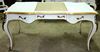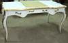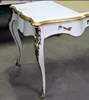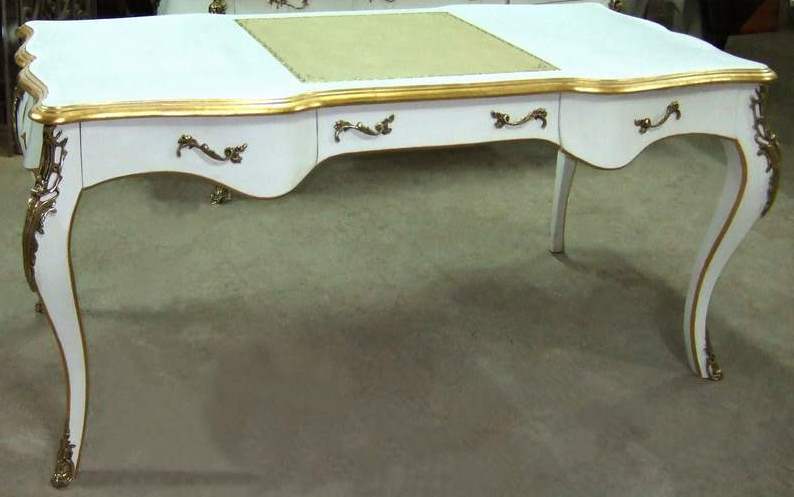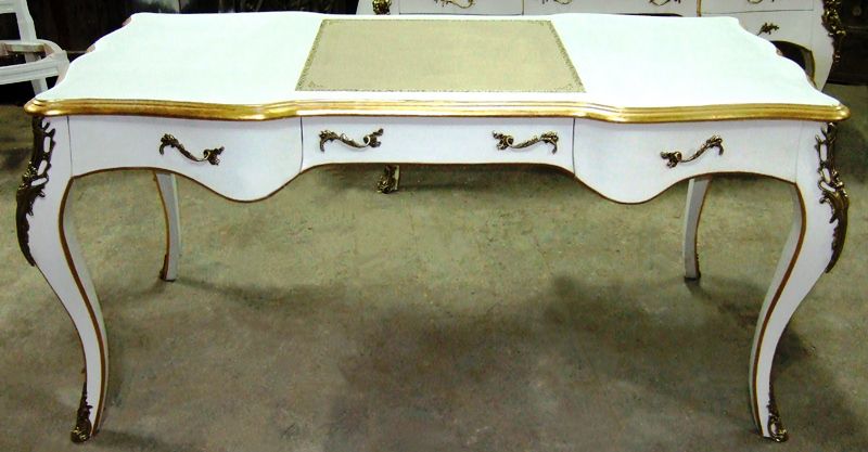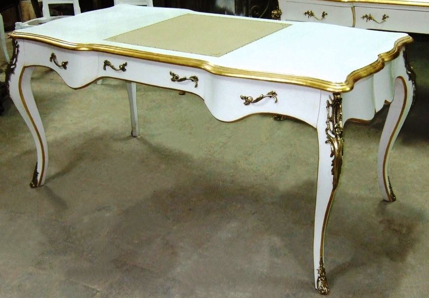 Delicate French Louis XV style desk with three drawers and cabriole legs, highly finished, painted in white, gilded on edges with French golden foils, centered on top with cream leather. The desk is ornamented with ormolu mounts and terminating with ormolu sabots.