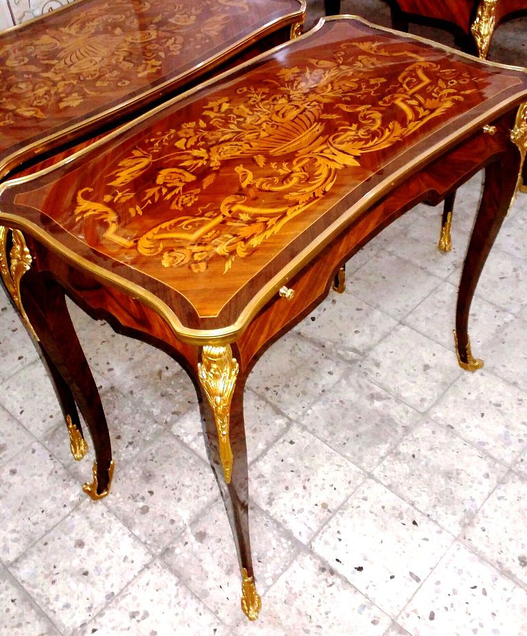 Elaborate produced Louis XV style ormolu mounted Lady Desk, with one drawers and fine foliate marquetry inlays. REF: AZ175