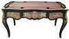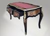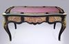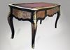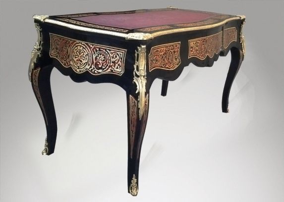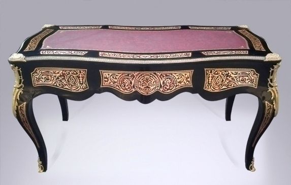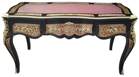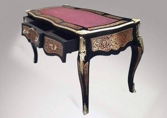 A Louis XV Andres Charles Boulle style ormulu-mounted tortoiseshell and engraved brass marquetry and ebony finish cabriole legs desk with three drawers and leather top.
