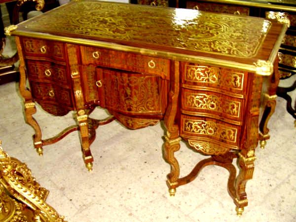 A Louis XIV Andres Charles Boulle style ormulu-mounted tortoiseshell and engraved brass marquetry and brown veneer inlaid Bureau Mazarin with seven drawers and one door.