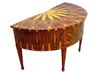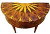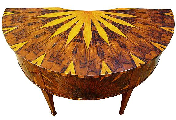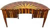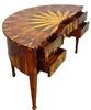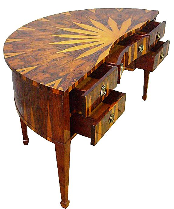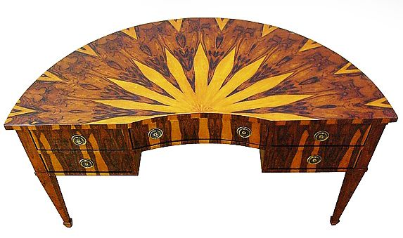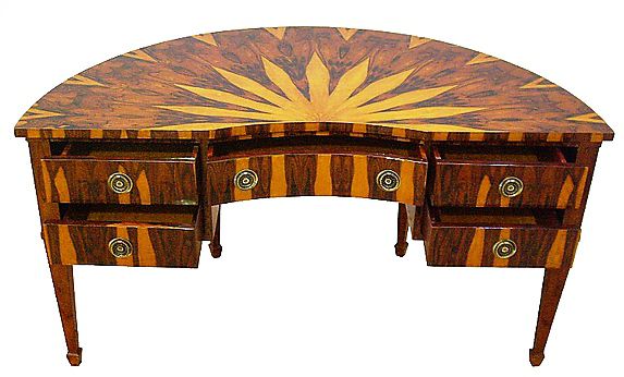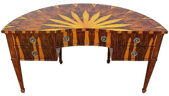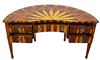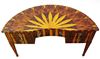 Eye catching Italian style demi-lune shape desk inlaid with fine sans traverse radial veneer pattern with five drawers, exceptional in style.