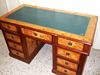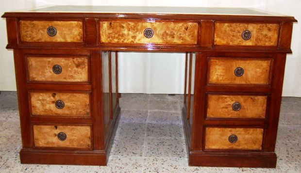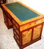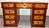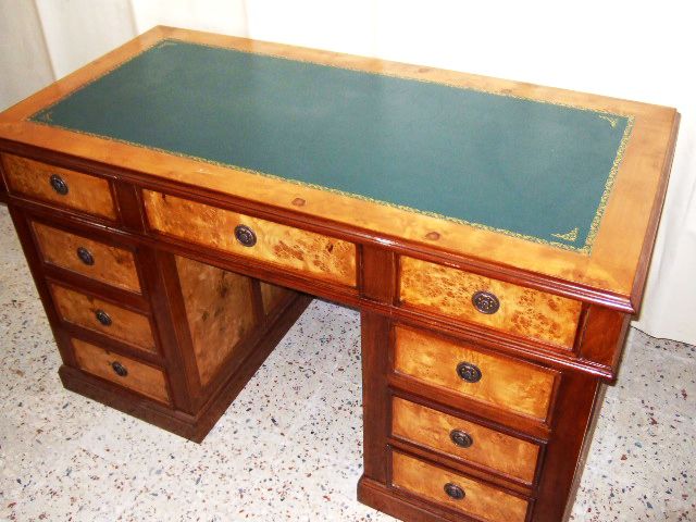 Fine veneer inlaid English style desk with nine drawers and golden framed green leather top. REF: AZ198