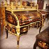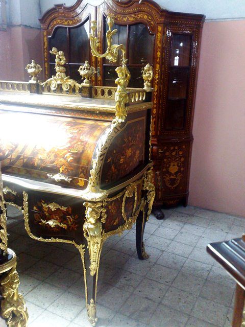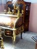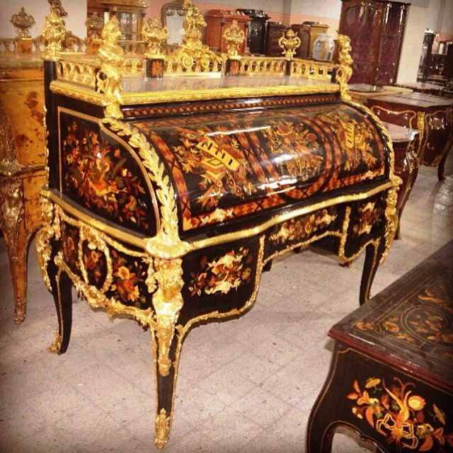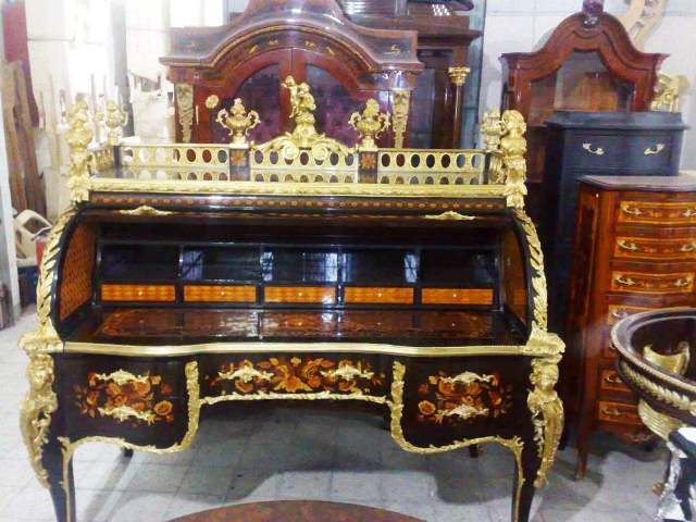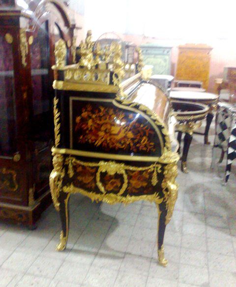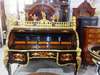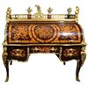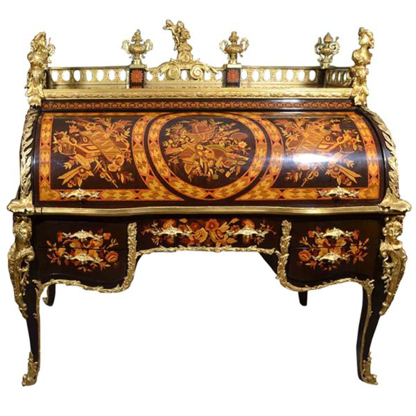 The desk opens cylindrically to a vast area for stationary with various cubby holes, drawers and slots with a sliding panel to extend the space of writing. The desk is ornamented with ormolu foliate works, figures, miniatures, female busts, urns, cherubs and ormolu plaque of putti to the back.