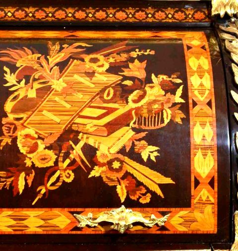 Different Louis XV cylinder Bureau Du Roi, produced with colored veneered marquetry patterns representing trophies, educational items, musical instruments and flower bouquet in different styles.