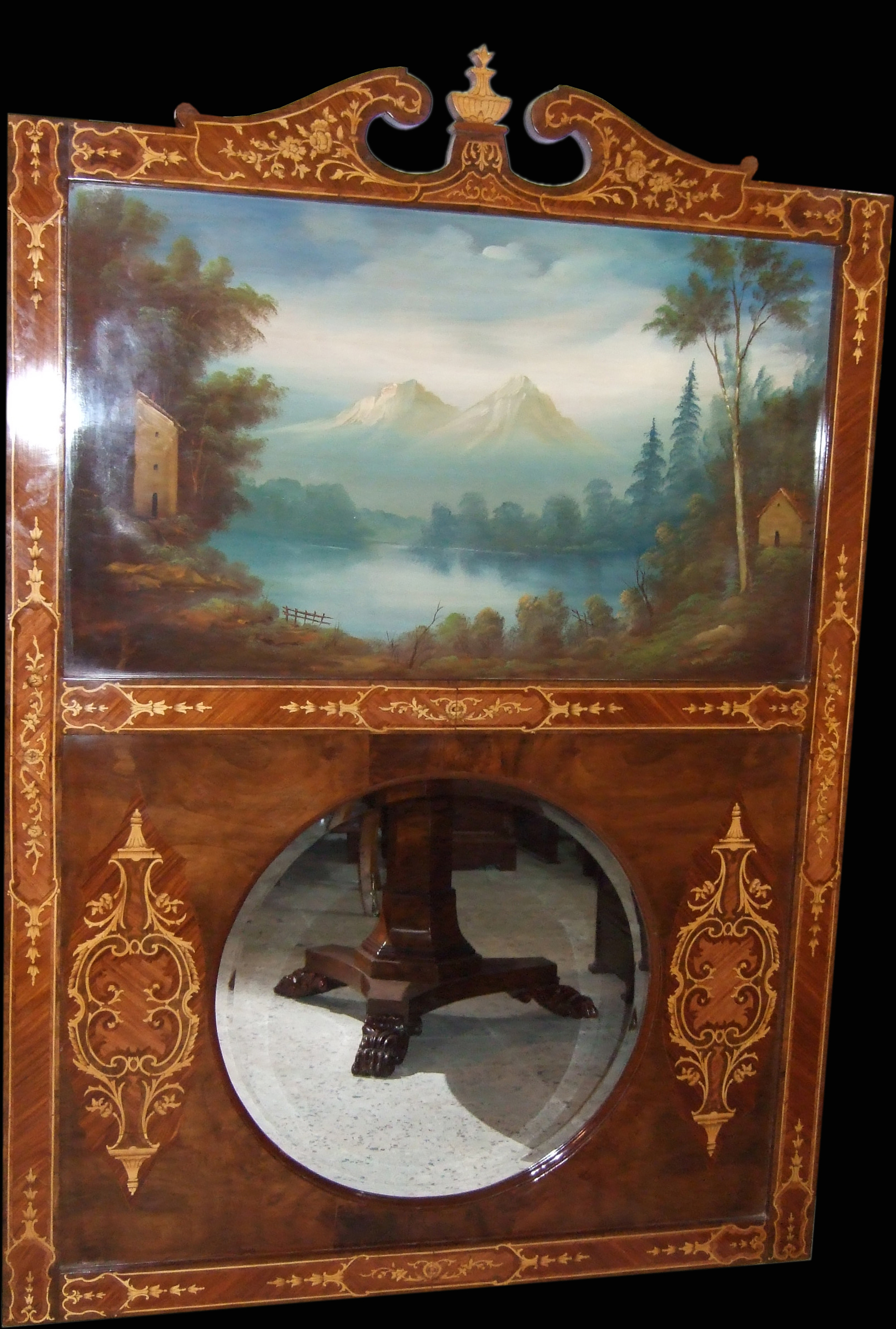 Italian Wooden Trumeau REF: A3840 Beautiful landscape in the upper part inlaid with marquetry all over, with rounded mirror in the lower part. H : 170 cm W: 120 cm