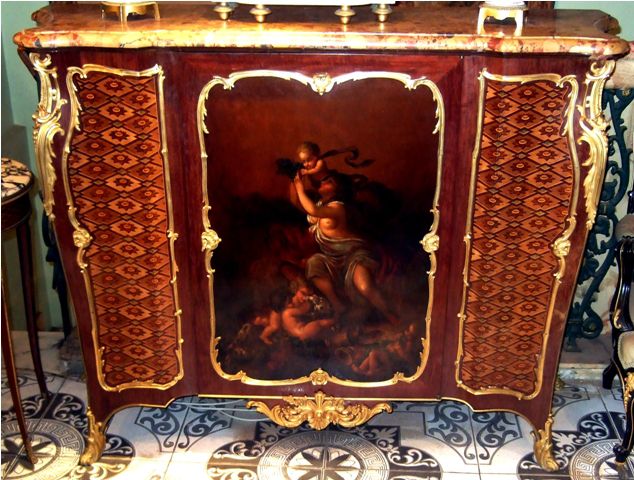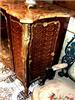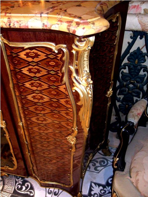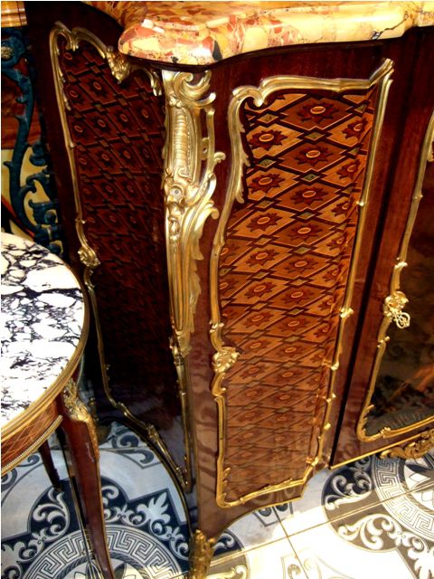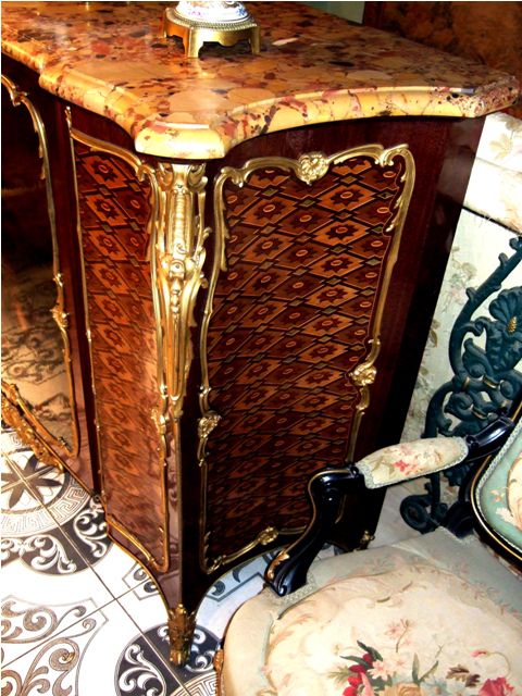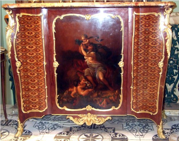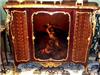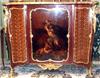 A Louis XV French ormolu-mounted mahogany, parquetry and Vernis Martin style side cabinet by Henry Dasson dates to the late 19th century, finely mounted with bronze ormolu and highly inlaid with parquetry with a beautiful brêche d'alep marble top, the front centered by a cupboard door on the Vernis Martin style, depicting a mythological scene, flanked to each side by a parquetry design, all within a foliate frame, the sides each with a parquetry panel within a similar frame, on four foliate bronze sabots.