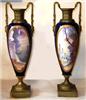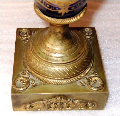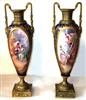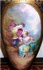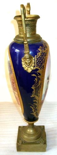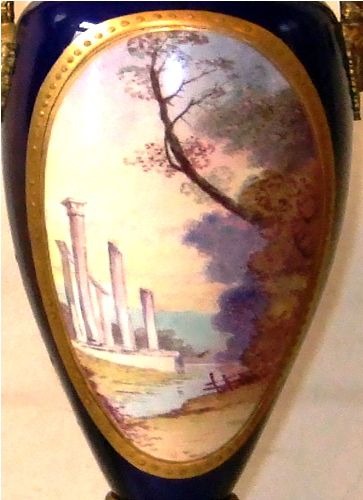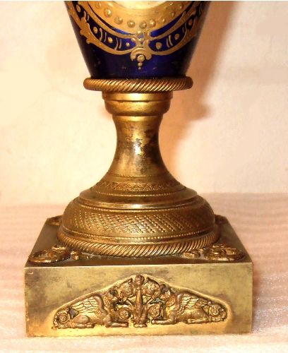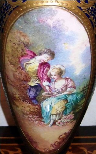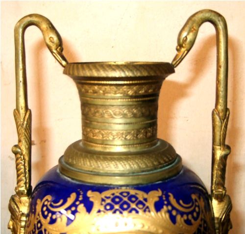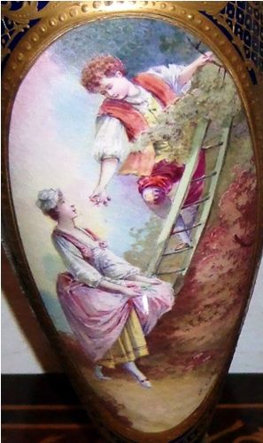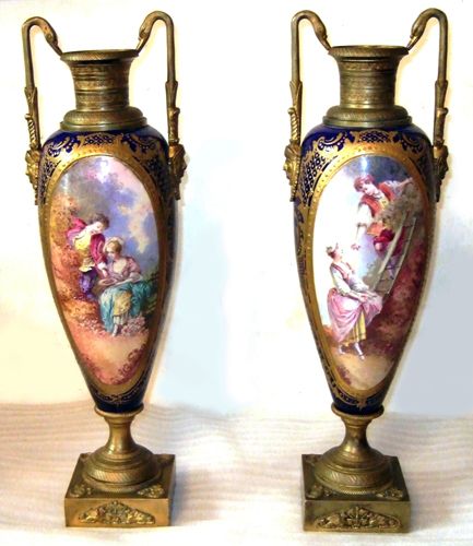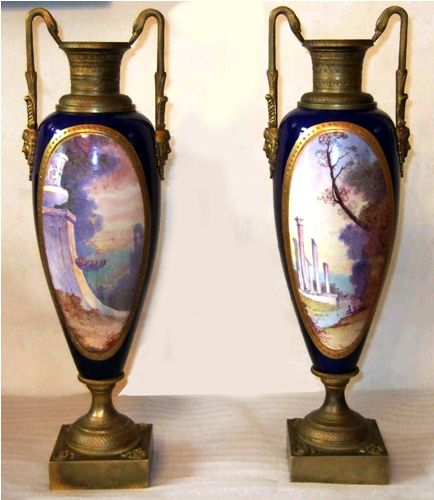 A pair of enchanting 19th century French sevres style ormolu-mounted cobalt blue Porcelain Urns signed E.Carelle, the elliptical bodies of the urns are swan handled ends with gargoyle. The miniature which is with gilt heightened borders depicting boys harvest fruits from the trees to their ladies, with an incised square base.