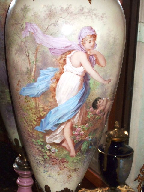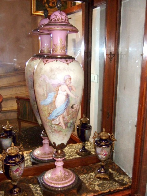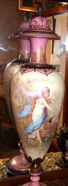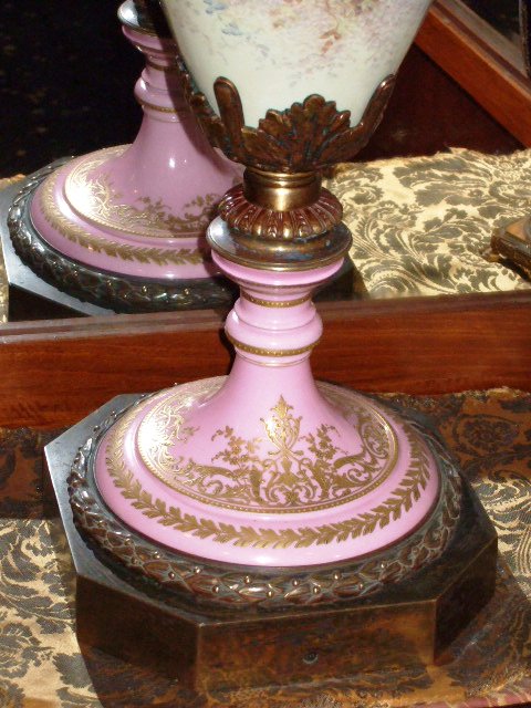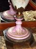 Elegant antique full miniature Pompadour pink large French signed porcelain Sevres vase with cover with.