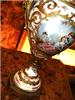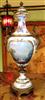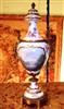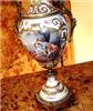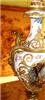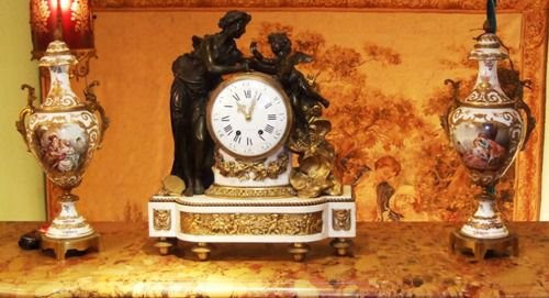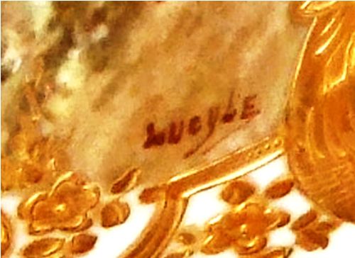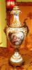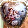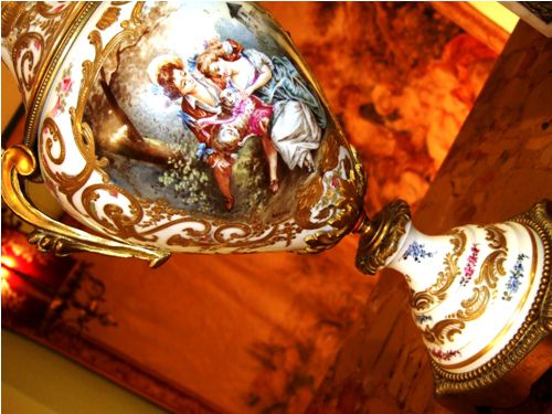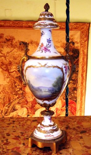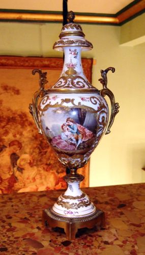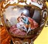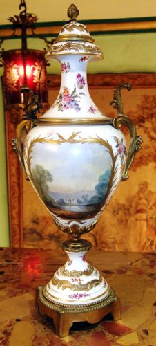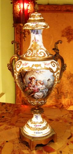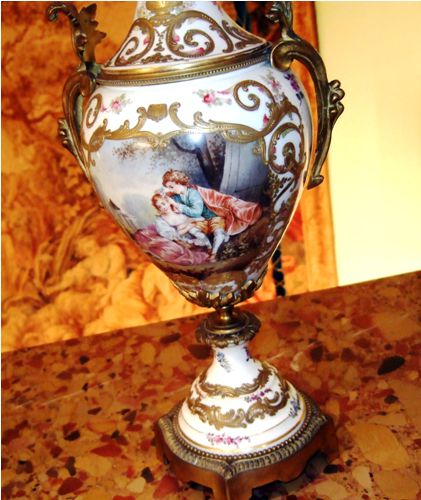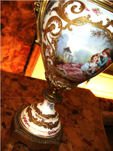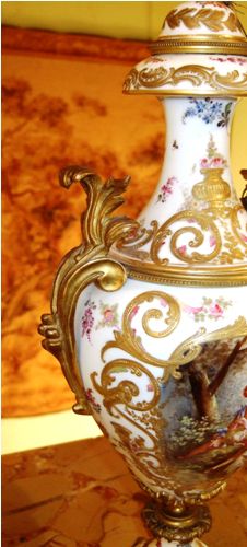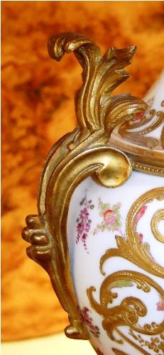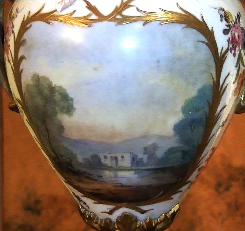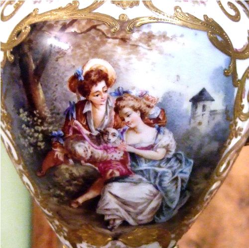 A pair of rare and beautiful late 19th century white ground French Sevres style ormolu-mounted porcelain vases, both signed Lucyle, ornamented with raised gilt scrolls and painted with bouquets and sprigs all over and surrounding the miniatures which are painted with beautiful romantic court scenes and landscape on the reverse, the bulbous body flanked by foliate scrolled handles.