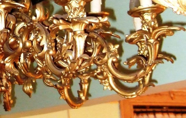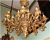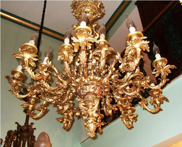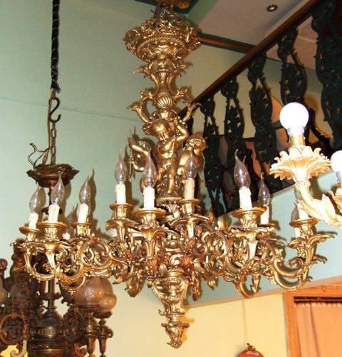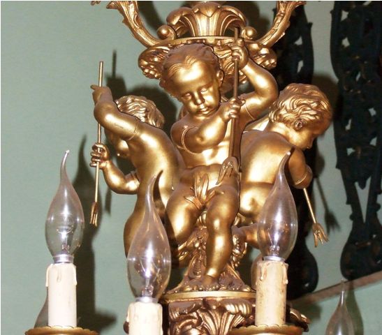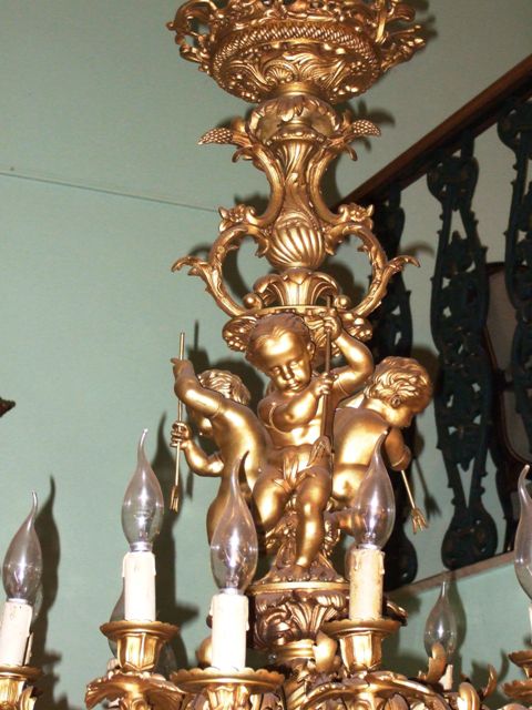 One of a kind Belle Époque antique French Louis XV style Rococo bronze palatial chandelier, unsurpassed casting, beautiful foliate adornments terminate with twenty arms with twenty lights, in the center of the main body three cherubs represented holding lances. The chandelier is in excellent condition.