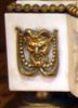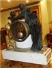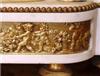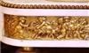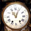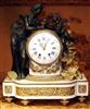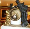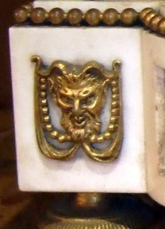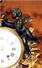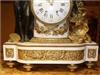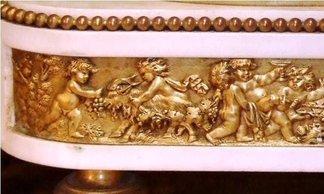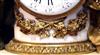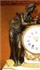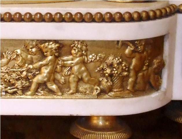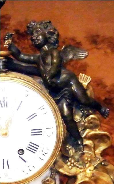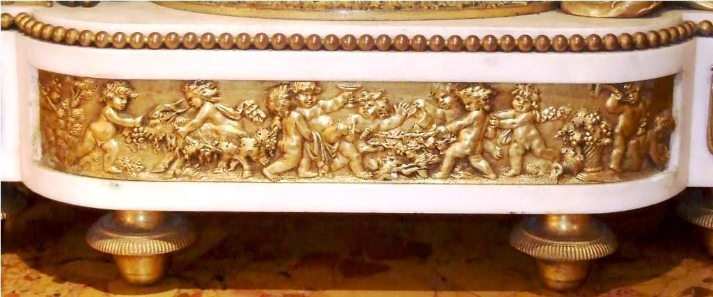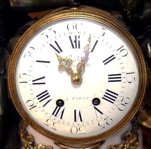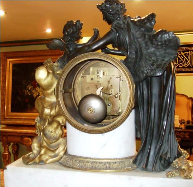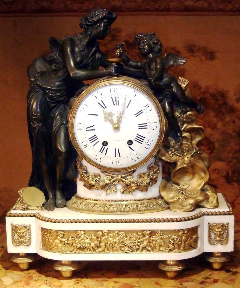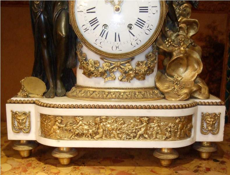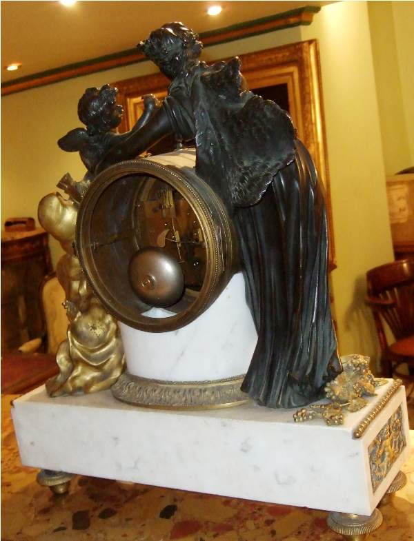 French Louis XVI style, first quarter 19th century, gilt, patinated bronze and carrara marble mantel clock, modeled with a classical draped maiden and a cloud-borne putto representing "Venus & Cupid" surrounding a signed circular white enameled clock dial and engraved pierced hands movements; twin barrels, silk suspension with anchor escapement countwheel strike on bell, pendulum. The circular center part surmounting a cylindrical column ornamented with ormolu floral swags and ribbon terminating with ormolu engraved frieze mounting a white carrara marble plinth inset with relief-cast panel of playful putti and two satan ormolu figures to both sides, the marble plinth stands on 6 toupie feet.