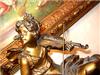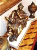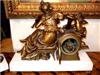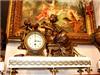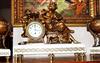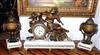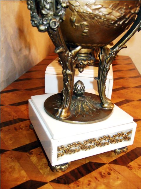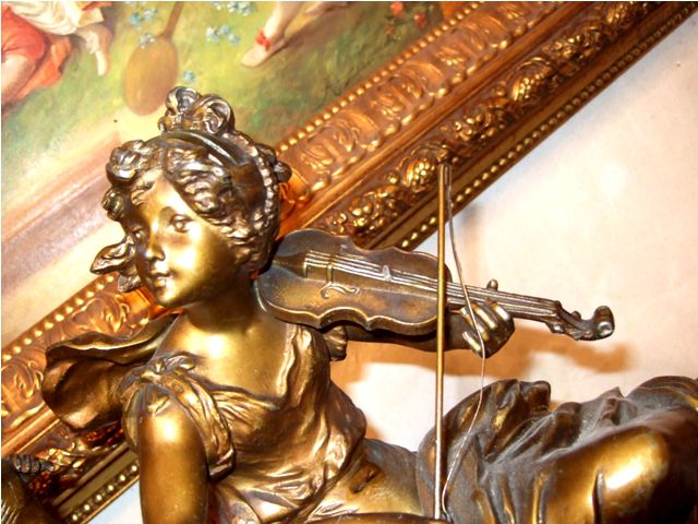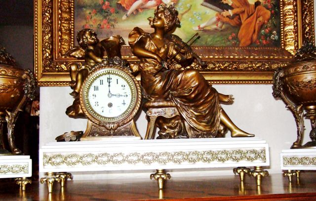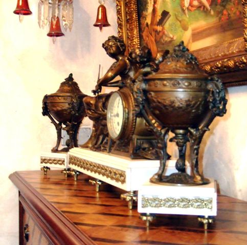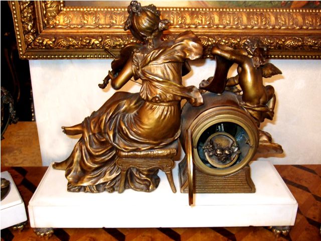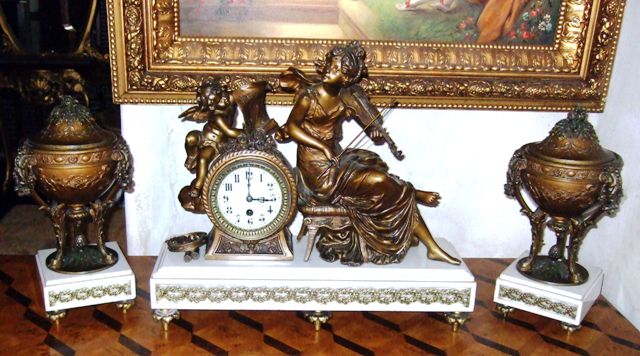 Beautiful in details French mantel clock garniture set consists of a beautiful hand crafted bronze clock with a matching of a lovely pair of cassolettes with beautiful bronze garland details, modeled with a classical draped maiden plays on violin sitting on a crafted banquette and a cloud-borne putto holds the musical note for her, representing "Venus & Cupid" , the clock and the pair of engraved cassolettes are based on a white marble plinth. The with Roman numerals on an Enamel dial center.