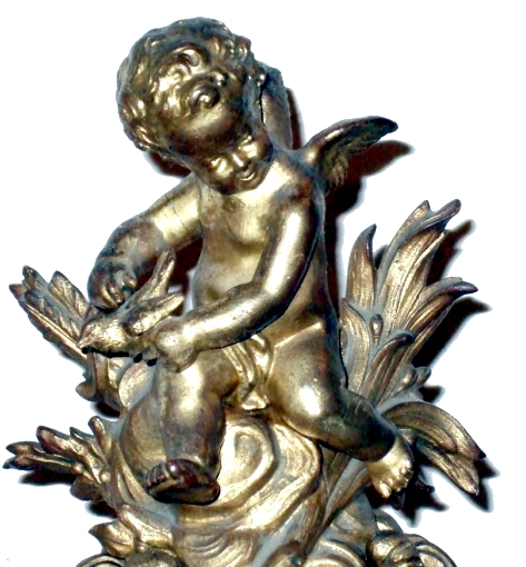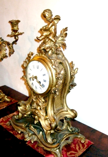 French middle 18th century gilt bronze Louis XV mantel clock and candelabra garniture set. The clock with a cherub surmounting the top, the case shape ornamented with foliage and flowers setting on a serpentine shaped gilt bronze base on a scrolling feet, the timepiece is of white enamel dials with Roman numerals. Surrounding the clock a sensational pair of French Louis XV five arm candelabras with a beautiful quality in fabrication, an intricate pierced design and scrolled work throughout with foliage carvings, raised by a square base.