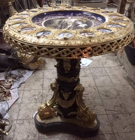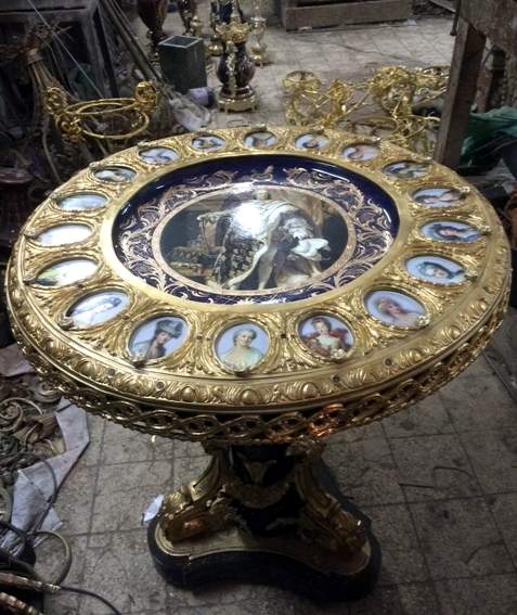 REPRODUCED NAPOLEON III -LOUIS XVI STYLE GILT ORMOLU, EBONIZED AND PORCELAIN PLAQUE MOUNTED, COBALT-BLUE GROUND SEVRES CENTER TABLE , on the late 19th century style, France , depicting Louis XVI and high ranking ladies of his court, while portraits of such renowned ladies as Marie Antoinette and the Princesse de Lamballe grace 17 surrounding plaques. The table rests on a tripod black wood leg. It's ornated with a rich chiselled and double patina gilt-ormolu that reinforces the prestigious character of this furniture. Base ornated by scroll ribbons pedestal, foliages interlaces. Acanthus consoles, on low and top part, support the central part, decorated with mouldings; scroll ribbons flutes, joined by laurel and flowers and roses garlands.