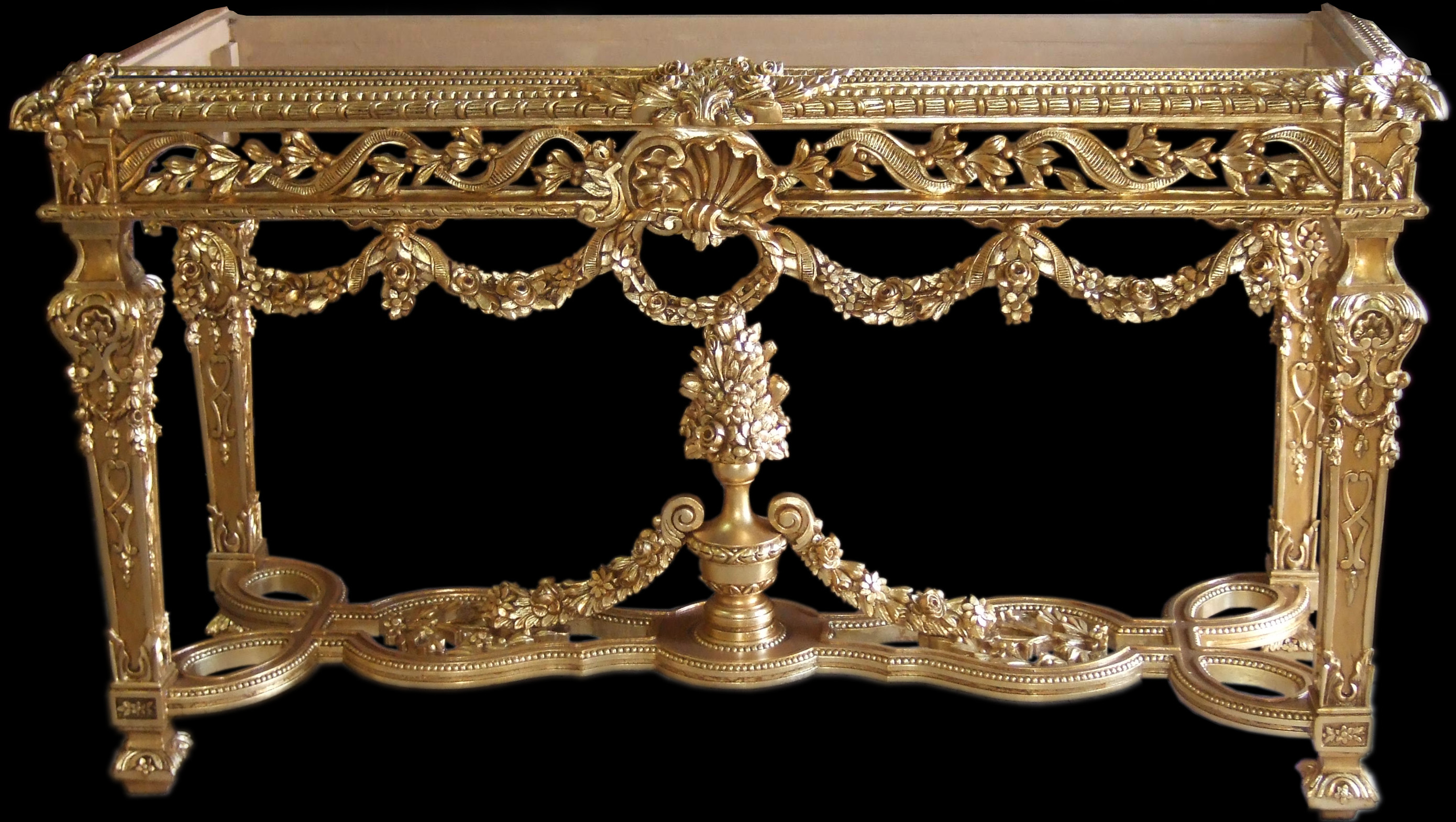 French Style Highly Carved Gilded Console Table decorated with garlands, sea-shells, swags & decorative motifs on the Rococo style. REF: A293 H : 90 cm |
