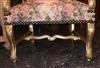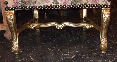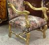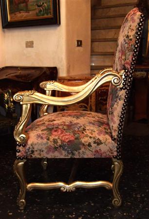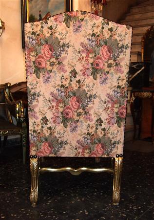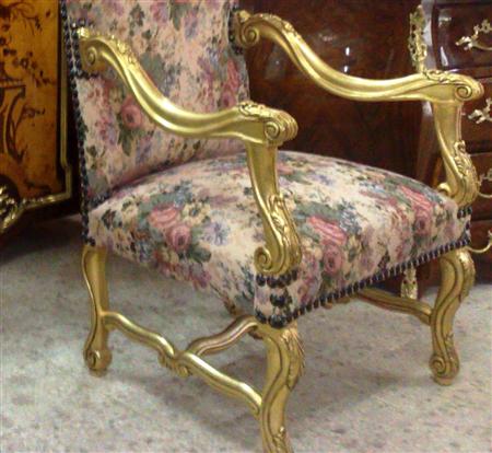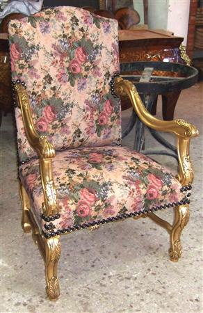 Pair of French style Louis XV upholstered He & She Arm Chairs / "Bergère" finely carved and gilded with a beautiful x stretcher, upholstered with sensational roses & flowers gobelin fabric fixed with large nails.