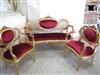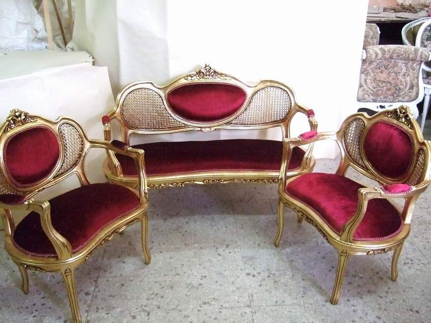 Small French Louis XV style salon set consists of one sofa and two arm chairs carved and gilded, with caned & upholstered back and seat with beautiful dark red velvet fabric.