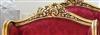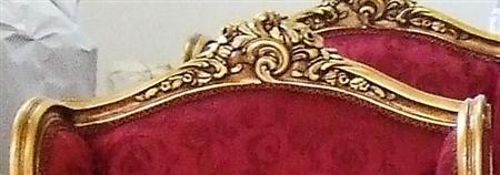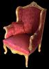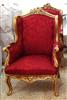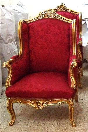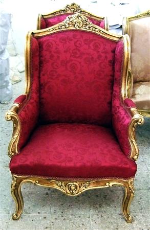 Handmade French Louis XV style Bergère (Living Room Arm Chair), gilded with French gold leaves, gilding finish in aged orangish color, carved with foliate ornamentation on top apron, hand rests and the cabriole legs as well, upholstered with beautiful red silk fabric ornamented with small leaves.