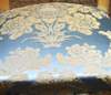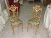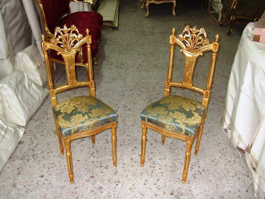 Pair of French style side chair / Musical Chair, finely carved with floral motifs, and gilded with french gold leaves, applied with patina finish, with a touch of Louis XVI style, upholstered with a matching reflective royal style floral silk fabric.