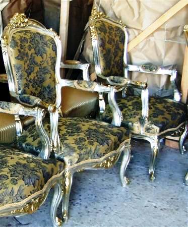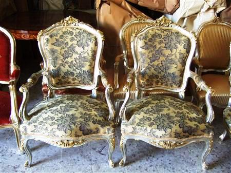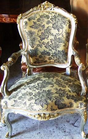 Carved, silvered and gilded French Louis XV style arm chair, upholstered with a matching fabric, for tastes which love silver color.