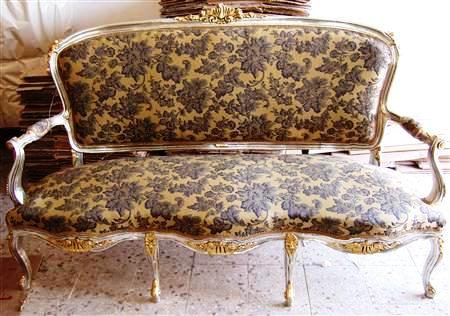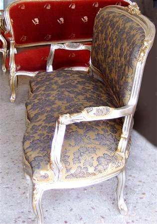 Pure French Louis XV style salon set consists of three pieces, beautifully carved with shells and floral motifs, silvered and gilded on carvings with french gold & silver foils and upholstered with very elegant matching fabric.