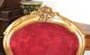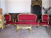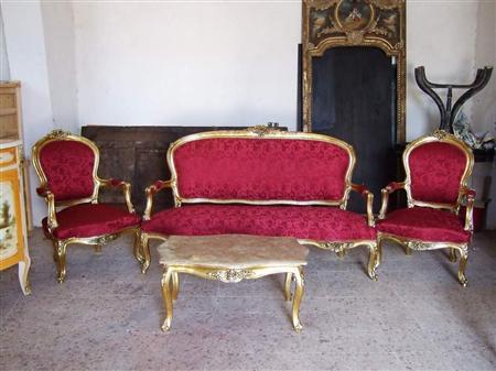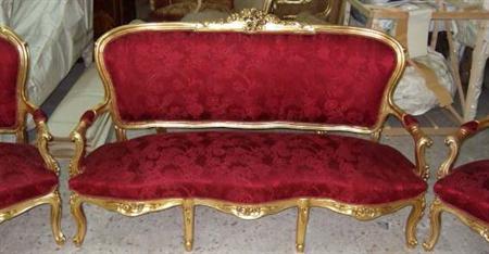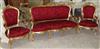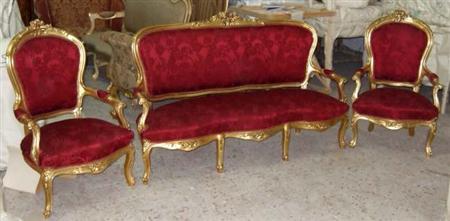French Louis XV style three pieces salon set of a sofa and two arm chairs beautifully carved & gilded with french gold leaves & upholstered with very charming red silk fabric. Extra center table per request.