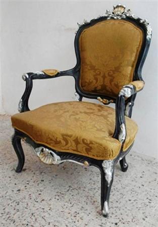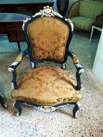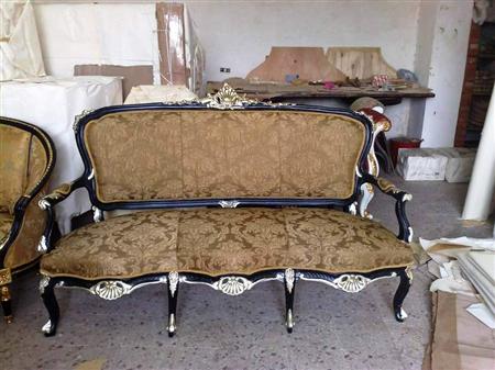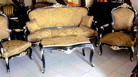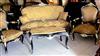 One sofa and two arm chairs French Louis XV style salon set carved with shells and floral motifs, painted in black & gilded with french gold / silver leaves on carved areas with aged finishing, upholstered with very precious damask fabric. Extra center table per request.