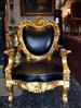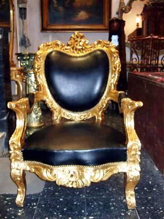 Carved and bright gilded French style throne arm chair, upholstered with black leather. REF: A368B