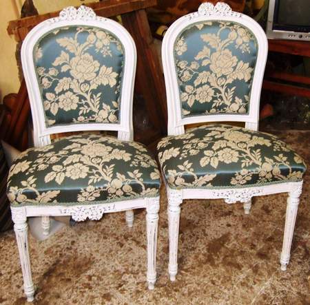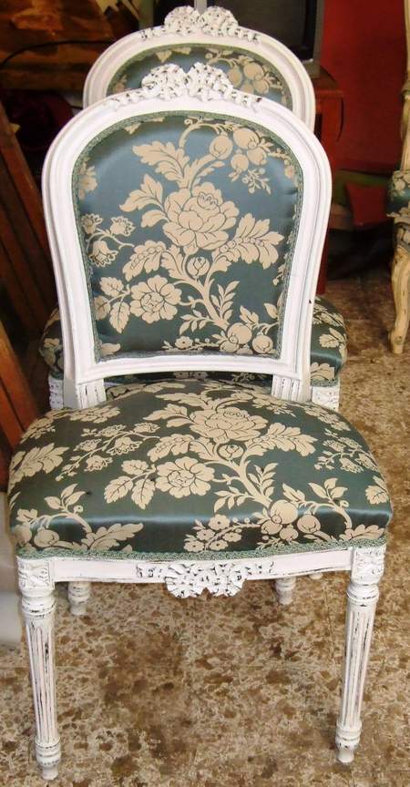French Louis XVI style chair, painted and finished in white color, with a touch of aged finishing and scratches on black, carved with ribbons on top and base, upholstered with royal blue floral silk fabric.
