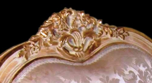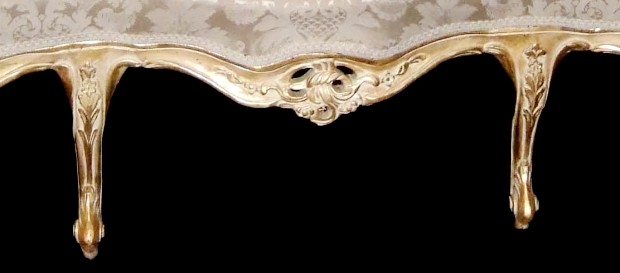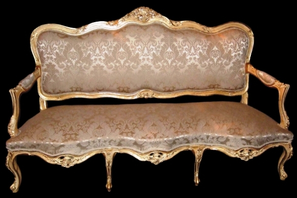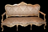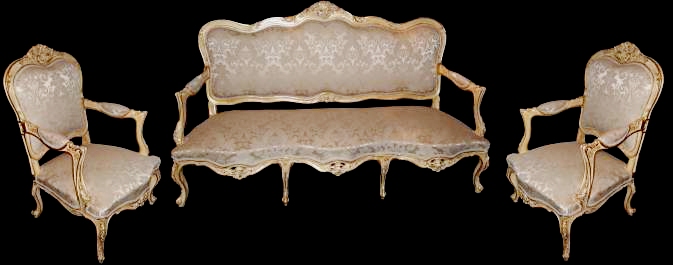 Large Louis XV style salon set consists of 3 pieces, carved with floral motifs, painted in cream color and gilded with french gold leaves on edges and carvings. (aged dusty finishing) imitating the pristine look and upholstered with a matching damask fabric.