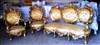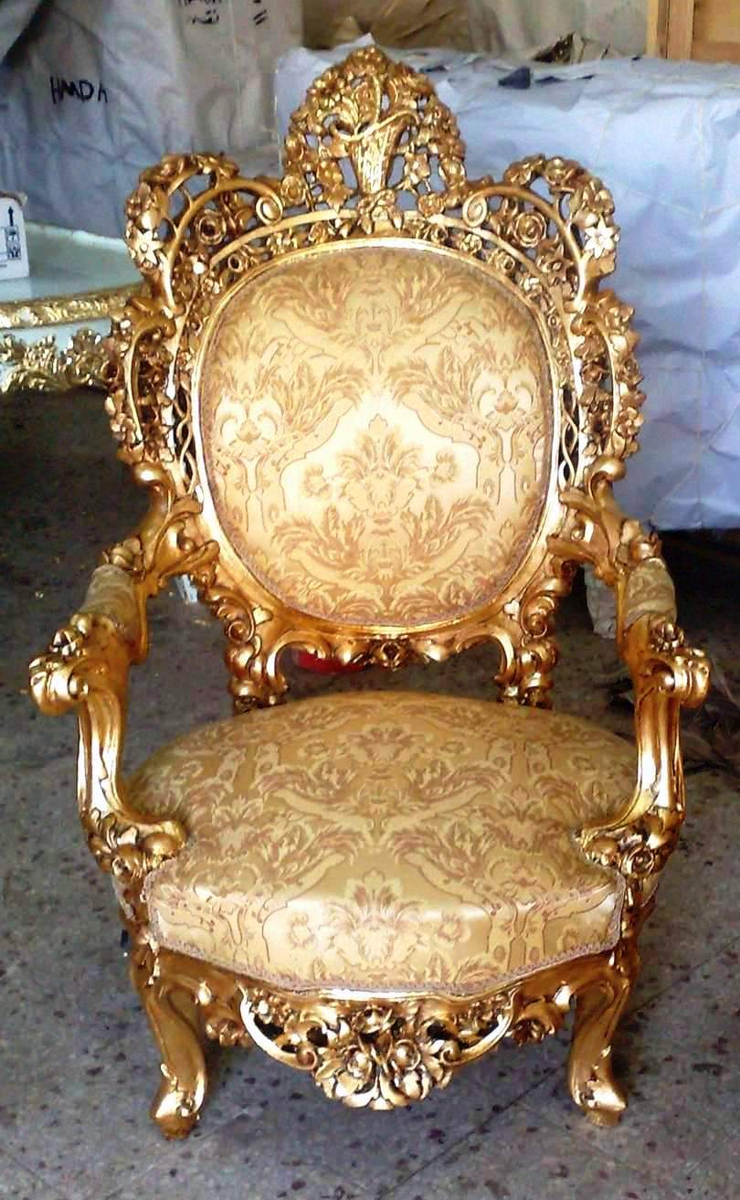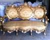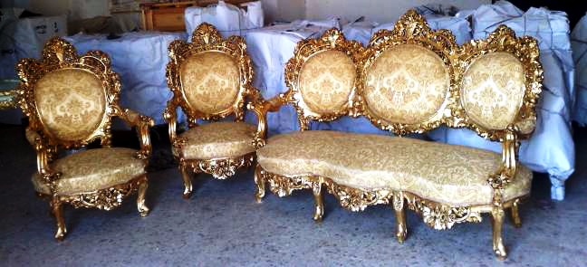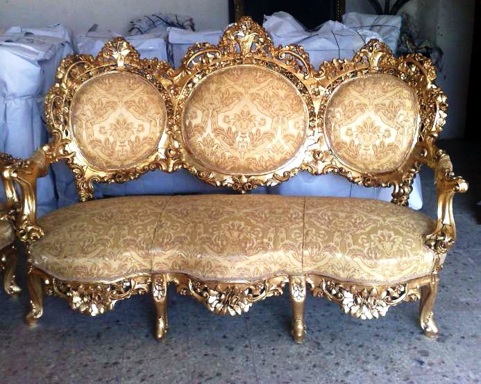 Old and renewed, Royal Louis XV style french salon set of one three seat large sofa and two throne arm chairs, full of floral carvings, and gilded with french gold foils, upholstered with a matching cream royal style fabric.
