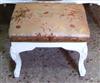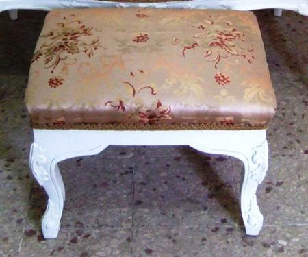Louis XV style foot stool, carved and painted in white color, upholstered with beautiful foliate damask fabric.