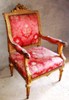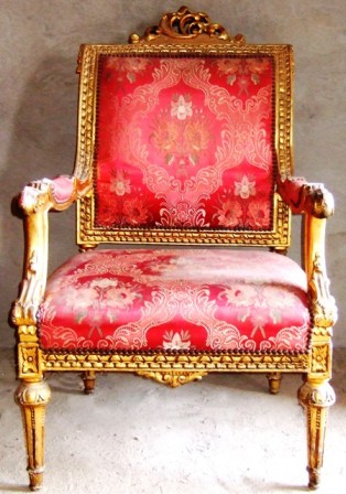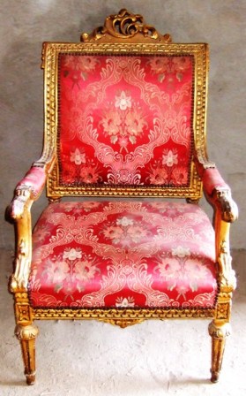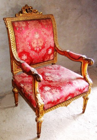 Antique unrestored Louis XVI style throne arm chair - beautifully carved and gilded on the French style, fabric to be re-upholstered per request.