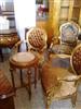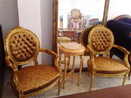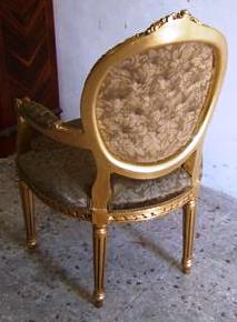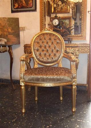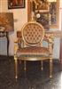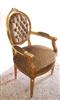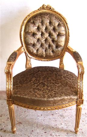 French Style Louis XVI arm chair highly carved and gilded, upholstered with a golden brown velvet fabric in two matching colors with a capitoné back.