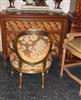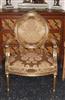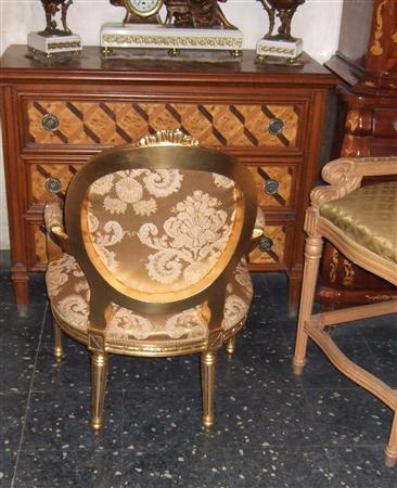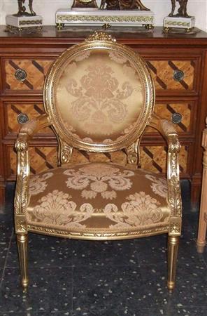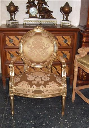 French Style Louis XVI arm chair, carved and gilded with french gold foils, upholstered with a golden creamy royal style fabric.