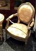 French Louis XVI style arm chair carved and gilded with french gold leaves, upholstered with a golden creamy color damask fabric.
