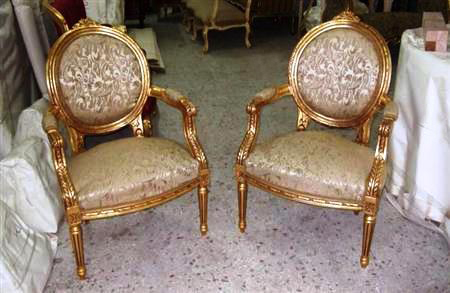 French Style Louis XVI arm chair, carved with foliate patterns and gilded with french gold foils, upholstered with a delicate damask silk fabric.