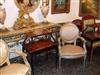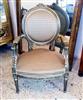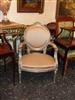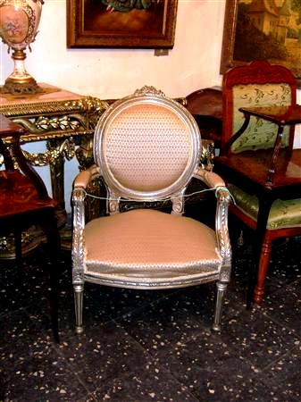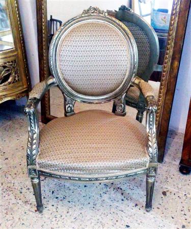 French Style Louis XVI arm chair highly carved and silvered, upholstered with a delictae style damask fabric and finishedin antique style.