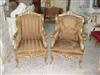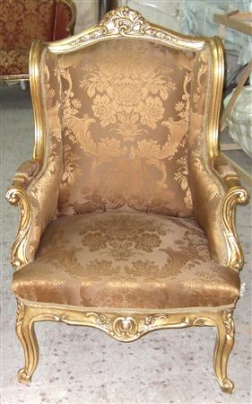 French Louis XV style Bergère (Arm Chair), gilded with French gold leaves, carved with foliate ornamentation on top apron, hand rests and legs as well, upholstered with golden brown color foliate silk fabric.