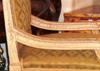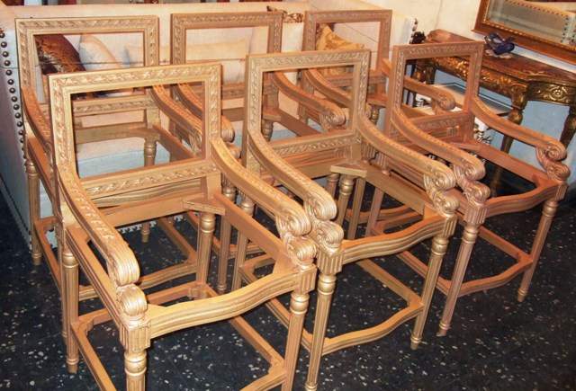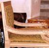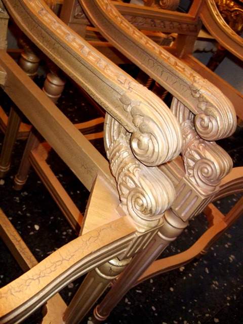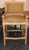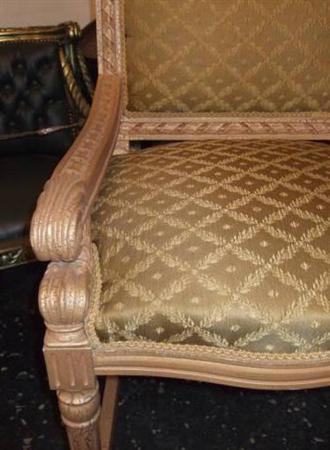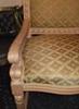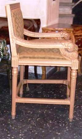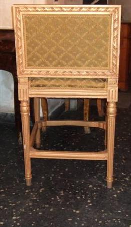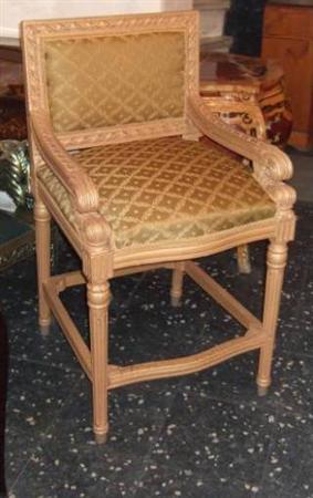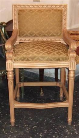 Louis XVI style bar stool, nicely carved all over and on hand rests, gilded with french gold foils then finished in crackle cream color and upholstered with a matching elegant fabric.