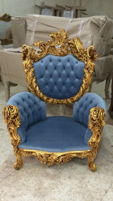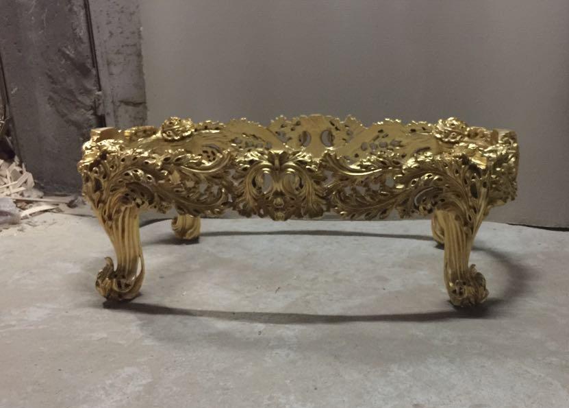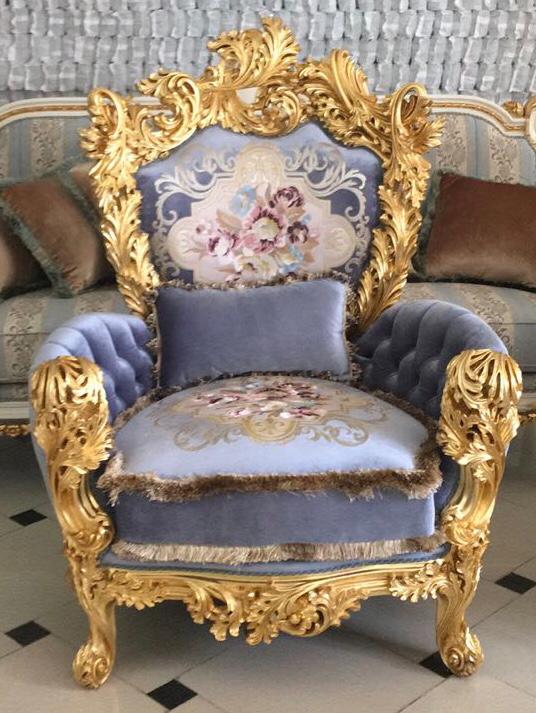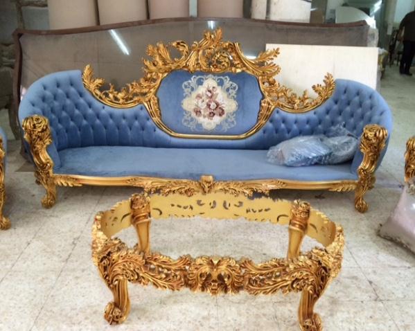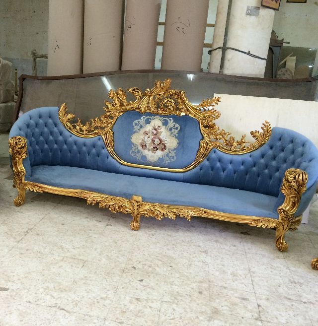 French Louis XV professionally Carved and gilded very large salon set of Sofa two arm chairs and center table with velvet fabric.